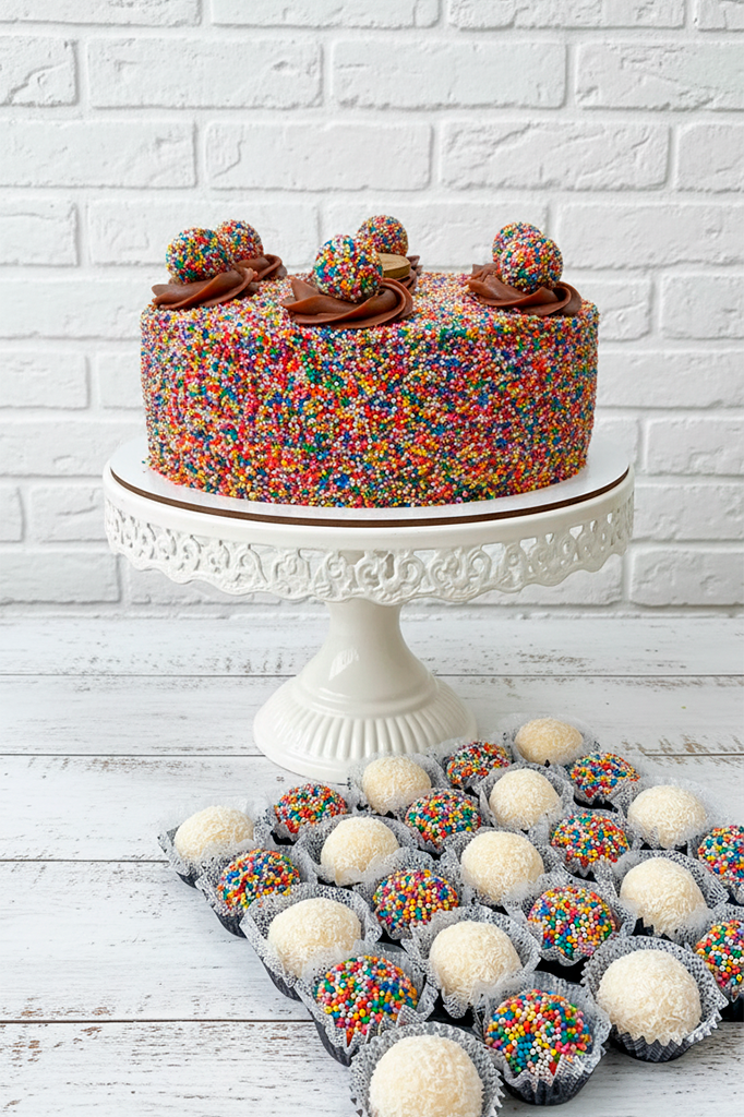 O Kit acompanha um bolo de 1,6kg + 45 docinhos.