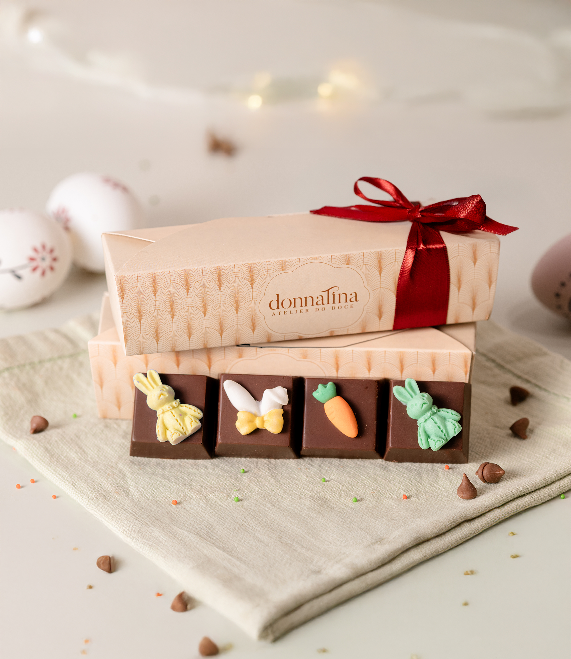Ideal para presentear e surpreender! Quatro bombonzinhos recheados com nutella, finalizados com uma decoração exclusiva de Páscoa.